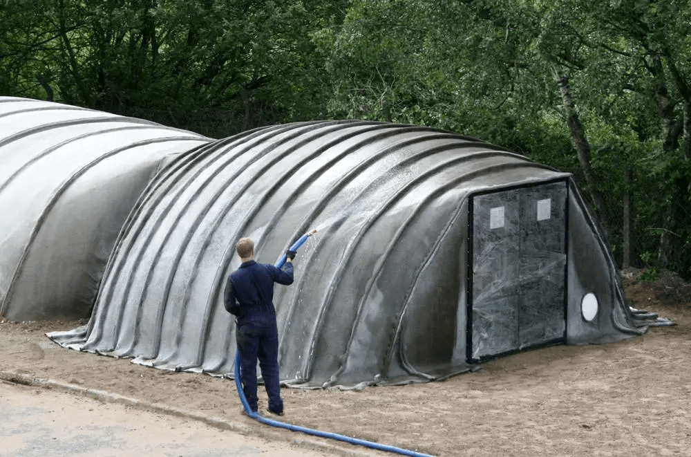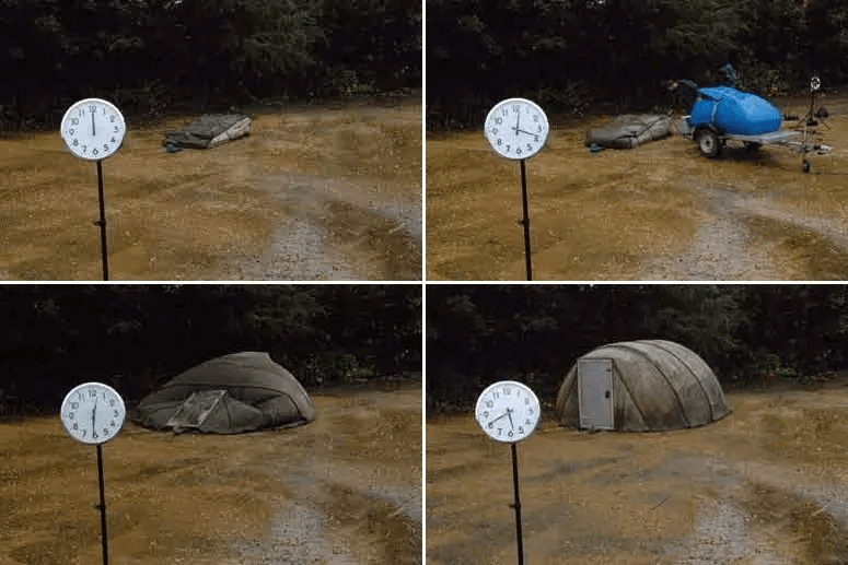 首先在一处空地铺上“充气帐篷”,花几分钟时间充满气成型后再打上地钉固定好,最后一步向帐篷淋上足够多的水,等待24小时,一座能够使用25年之久的帐篷就完成了。